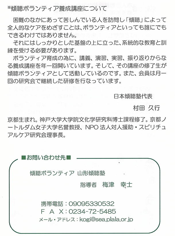一人でも多くの方々が傾聴ボランティアとして活躍して下さいますよう、お願いします。 |