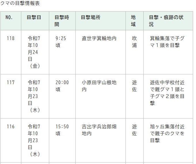 内容は遊佐町のクマ目撃情報から