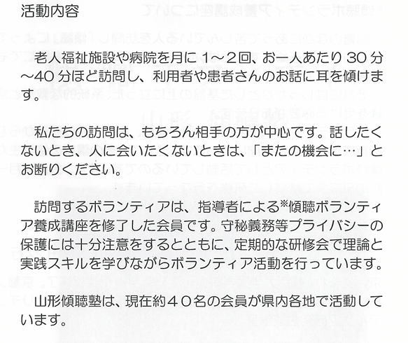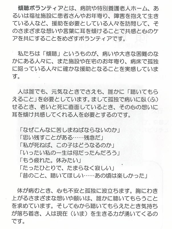 一人でも多くの方々が傾聴ボランティアとして活躍して下さいますよう、お願いします。 |