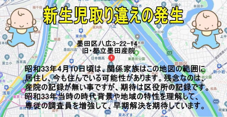 昭和33年4月10日頃、旧・都立墨田産院で発生した新生児取り違え