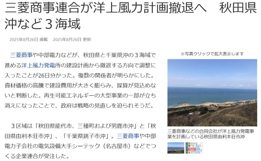 | 秋田県由利本庄市沖の洋上風力の予定業者(三菱商事連合)が、資材の高騰などを理由に撤退の方針と言うが、この余波で、遊佐町の事業計画も危うくなってきたようだ。丸紅はどう判断するのか。 |