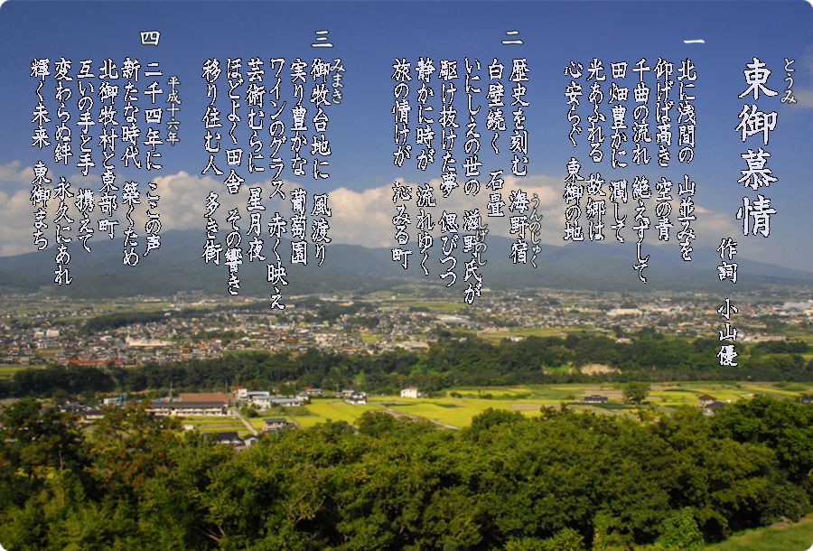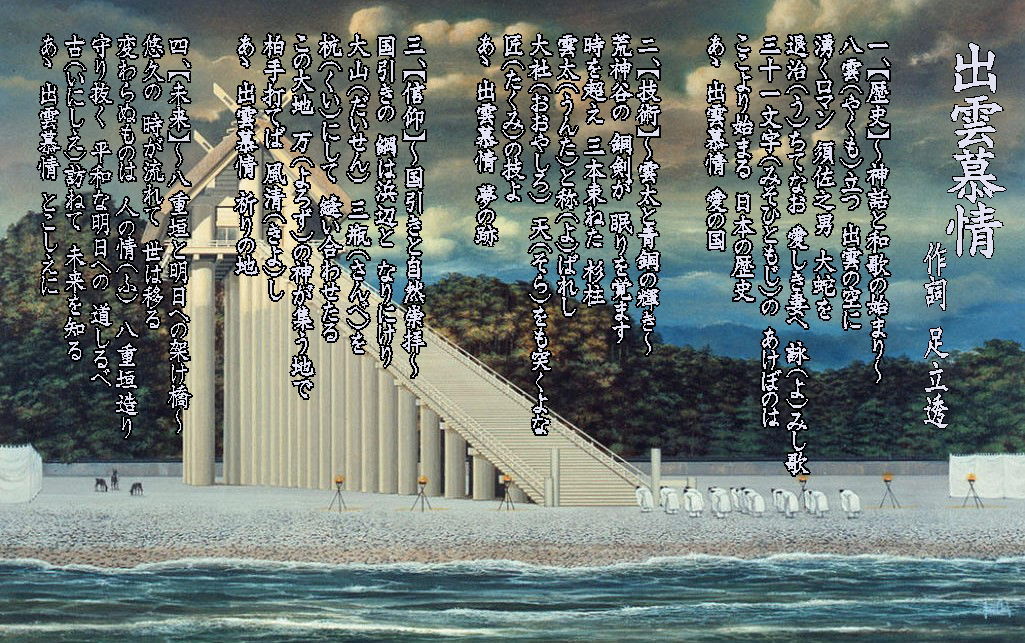 国引きの 綱は浜辺と なりにけり 大山(だいせん) 三瓶(さんべ)を 杭(くい)にして 縫い合わせたる この大地 万(よろず)の神が 集う地で 柏手(かしわで)打てば 風清(きよ)し あゝ 出雲慕情 祈りの地