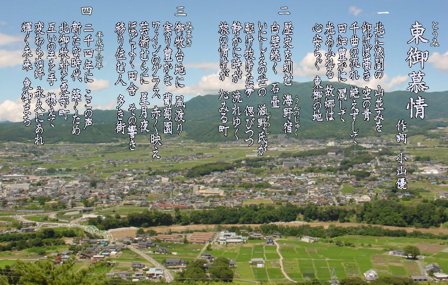 八雲(やくも)立つ 出雲の空に 湧くロマン 須佐之男 大蛇を 退治(う)ちてなお 愛しき妻へ 詠(よ)みし歌 三十一文字(みそひともじ)の あけぼのは ここより始まる 日本の歴史 あゝ 出雲慕情 愛の国