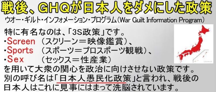 GHQ (連合国軍最高司令官総司令部)による、ウオー・ギルト・インフォメーション・プログラム(英語:War Guilt Information Program)WGIP()」は「戦争についての罪悪感を日本人の心に植え付けるための宣伝計画」と略されています。この名称はGHQの内部文書に基づくものですが頭文字のWGIPは長年タブー視 されていましたが、最近ようやく櫻井よしこ氏、西尾幹二氏、ケント・ギルバート氏ら一部の著名人が語りはじめていました。それが最近では、参政党の神谷宗幣ら一部ながら政治家も堂々と使いはじめたことで支持を拡大しているようです。この言葉を噛み砕くと、「戦争責任(ウォー・ギルト)広報(インフォメーション)計画(プログラム)」であり、この情報の記録は国立公文書館に保存してあります。これを一言で言うなら、日本人を腑抜けにして二度と立ち上がれないように、精神的にダメにする計画と言われています。6年8カ月の期間で、財閥解体、農地改革、軍の解体、労働改革、神道指令、東京裁判、言論統制、教育改革など、あらゆる方法で徹底して推し進めていたのです。真面目な日本人は、言われた通りにそれぞれを忠実に実施しており、現在も引き継がれているのです。WGIPで特に有名なのは、「3S政策」です。3Sとは、
