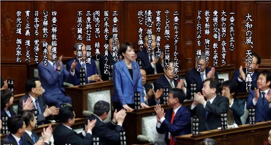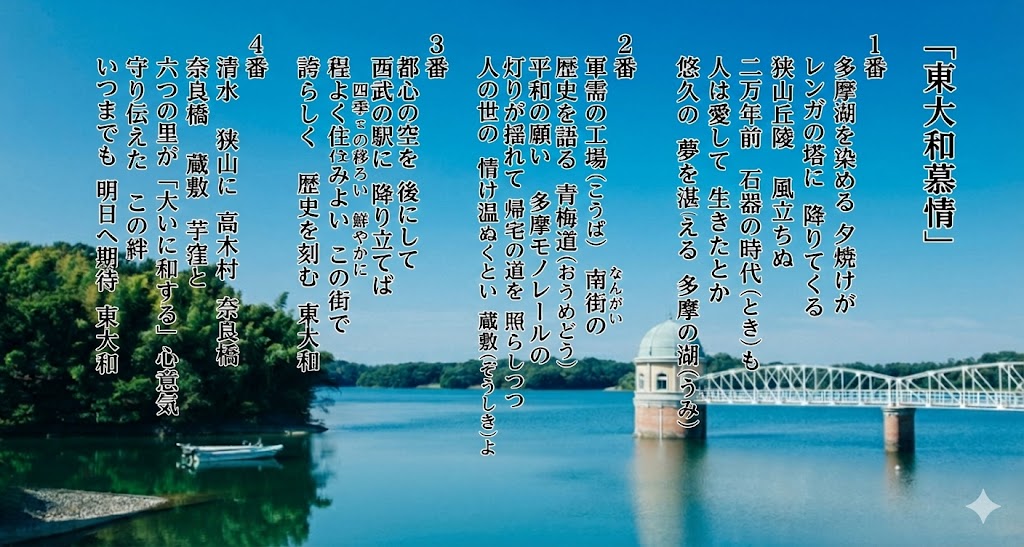 八雲(やくも)立つ 出雲の空に 湧くロマン 須佐之男 大蛇を 退治(う)ちてなお 愛しき妻へ 詠(よ)みし歌 三十一文字(みそひともじ)の あけぼのは ここより始まる 日本の歴史 あゝ 出雲慕情 愛の国