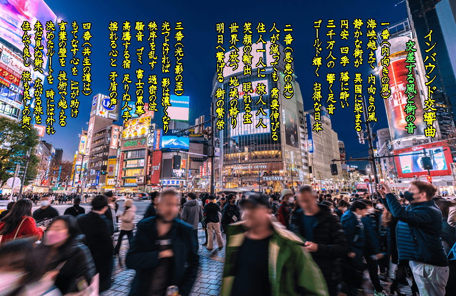 国引きの 綱は浜辺と なりにけり 大山(だいせん) 三瓶(さんべ)を 杭(くい)にして 縫い合わせたる この大地 万(よろず)の神が 集う地で 柏手(かしわで)打てば 風清(きよ)し あゝ 出雲慕情 祈りの地
